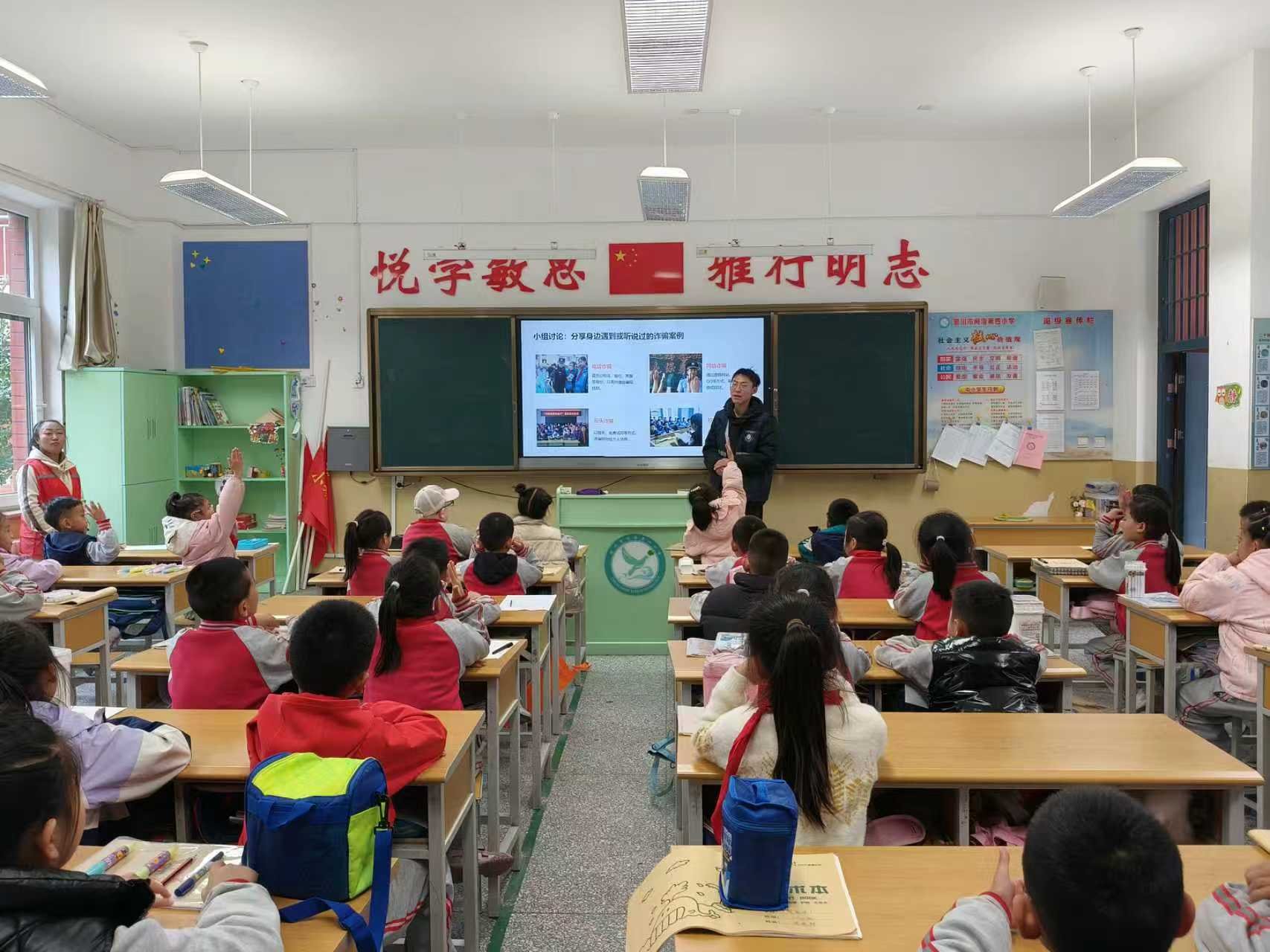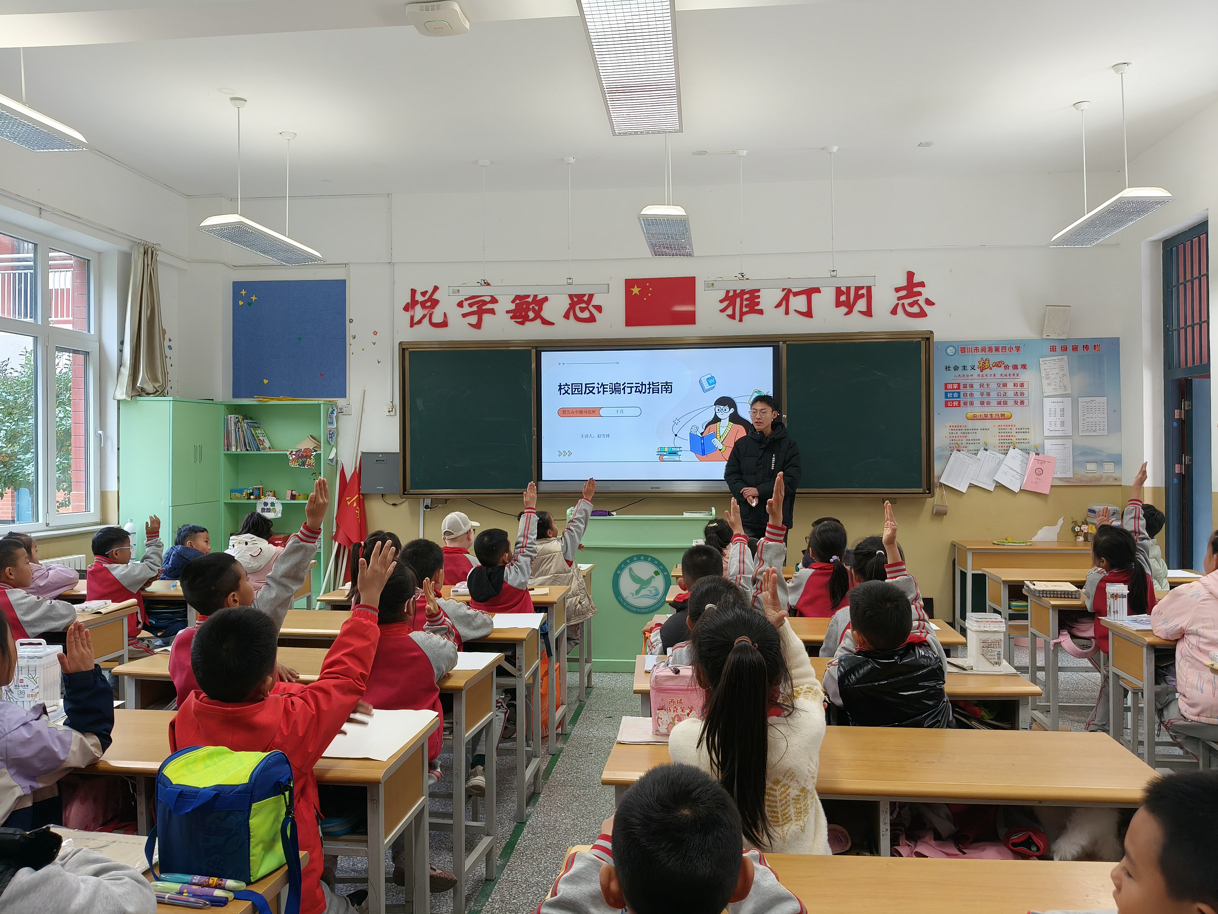 阳光透过明亮的窗户洒进教室,一场集历史文化浸润、安全知识普及于一体的系列主题实践活动在此热闹开展。10月21日下午,银川市国土空间规划编制研究中心联合贺兰山中路司法所、银丰社区走进阅海四小二年级(3)班,围绕“宁夏和银川的历史文化、反诈安全、食品安全”三个主题,通过趣味讲解、互动游戏、实物展示等形式,为孩子们带来了一堂生动又实用的“课外课”,让知识在轻松愉悦的氛围中深入人心。