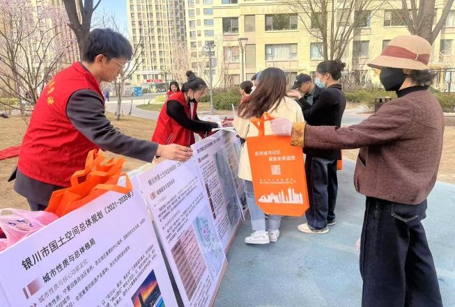 活动现场,市国土空间规划编制研究中心依托主题展板,围绕《银川市国土空间总体规划(2021—2035年)》开展专题宣讲。讲解员结合银川城市发展实际,用接地气、有温度的语言解读规划核心要义,从空间布局优化、生态环境保护到民生福祉提升,全面阐释城市未来发展路径,让群众直观感受规划与日常生活息息相关。现场还通过悬挂横幅、发放宣传资料等方式营造氛围,工作人员与居民面对面交流、一对一答疑,重点回应居住环境、公共服务等群众关切问题,认真听取意见建议,引导群众主动关注、参与和监督国土空间规划工作。